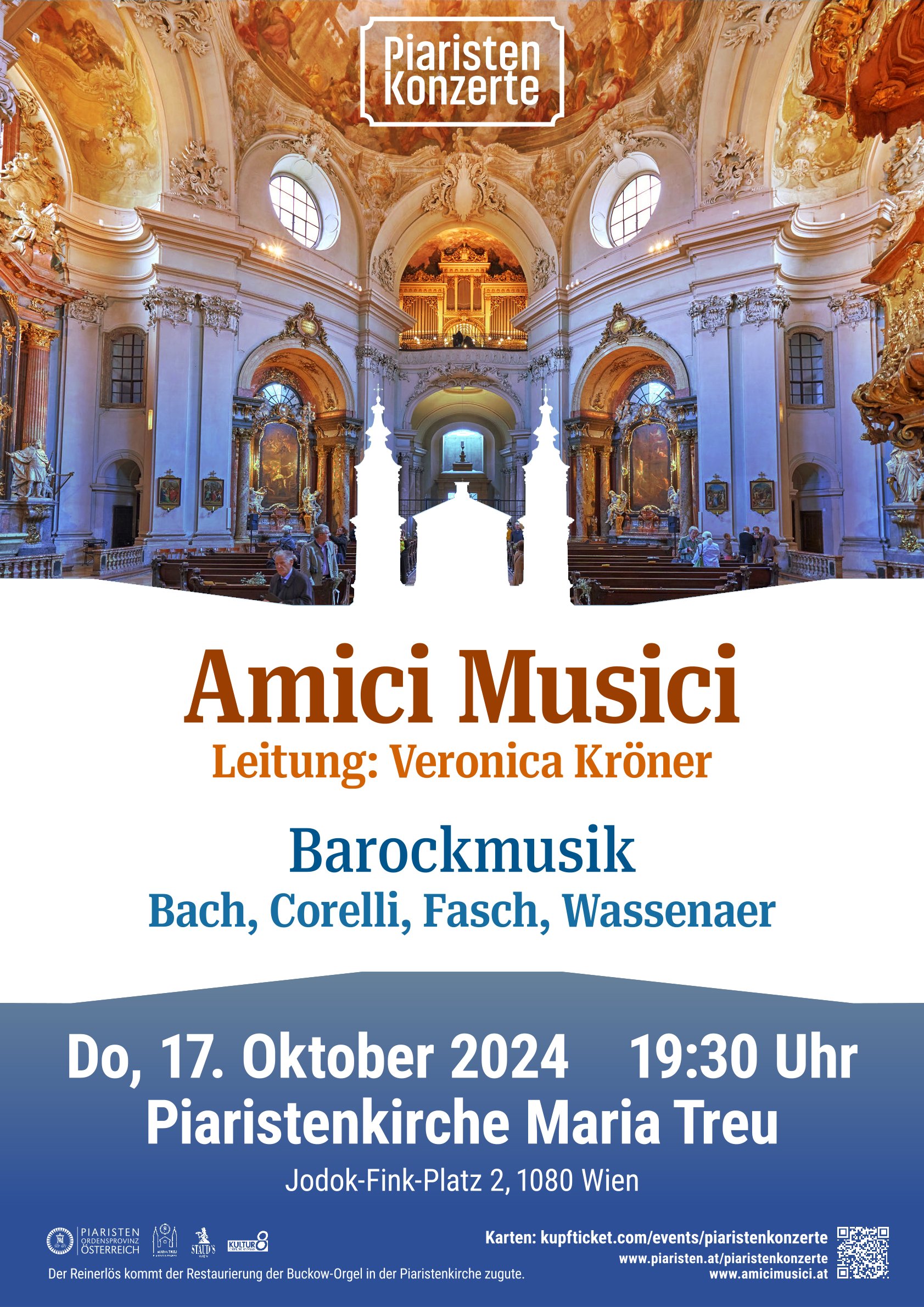 Auf dem Programm stehen neben Johann Sebastian Bach (Concerto in a-Moll BWV 1041) und Arcangelo Corelli (Concerto Grosso op.6/1) auch Johann Friedrich Fasch (Sonate in d-Moll) und Unico Willem van Wassenaer (Concerto Armonico in f-Moll). Die Leiterin der Amici Musici, Veronica Kröner, bringt ihre langjährige Erfahrung aus dem Concentus Musicus Wien, der Deutschen Kammerphilharmonie Bremen, dem RSO Wien und aus ihrer Unterrichtstätigkeit in Graz, Salzburg und Eisenstadt in die Arbeit mit den jungen Profimusiker:innen ein. Der Reinerlös kommt der Restaurierung der Buckow-Orgel in der Piaristenbasilika zugute.