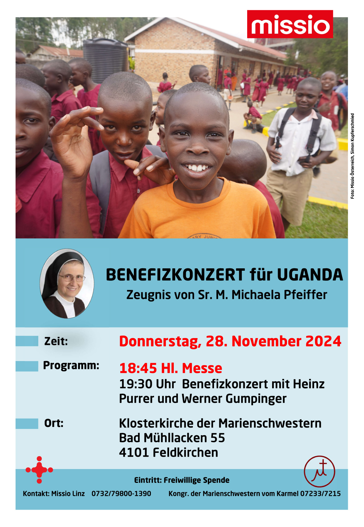 Am Donnerstag, 28. November, findet um 19.30 Uhr in der Klosterkirche der Marienschwestern in Bad Mühllacken ein Benefizkonzert von Missio-Diözesandirektor Heinz Purrer und Werner Gumpinger statt.